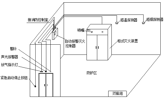 當(dāng)兩種探測器發(fā)出火災(zāi)信號時(shí),控制主機(jī)啟動(dòng)警鈴和聲光報(bào)警器,聯(lián)動(dòng)關(guān)閉防護(hù)區(qū)開口,進(jìn)入滅火啟動(dòng)延時(shí),達(dá)到設(shè)定的延時(shí)時(shí)間后,自動(dòng)啟動(dòng)滅火裝置。