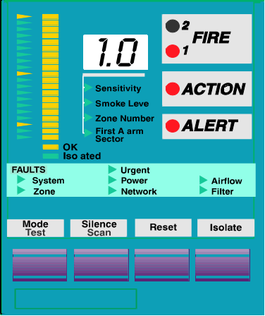 ●光柱指示器:由20個LED指示燈組成,其燈點亮的部分表示防護區(qū)煙霧的實際水平。