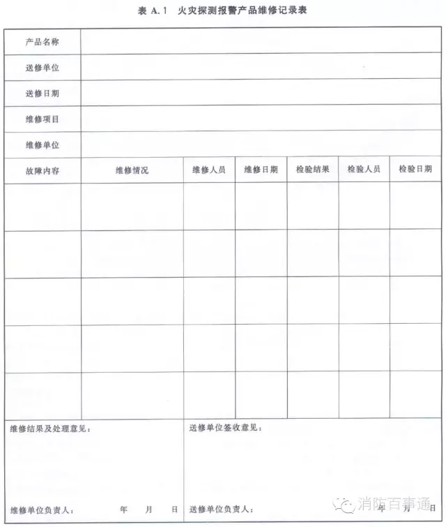 3.1.6承擔(dān)維修的企業(yè)應(yīng)做好維修記錄,與產(chǎn)品使用或管理單位各執(zhí)一份,并保存至該產(chǎn)品報(bào)廢?;馂?zāi)探測報(bào)警產(chǎn)品維修記錄表的格式參見附錄A。