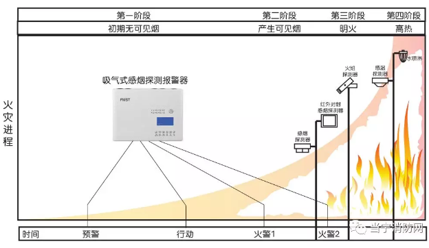 FMST的設(shè)計(jì)思想是針對(duì)火災(zāi)初期(過(guò)熱、悶燒、或低熱輻射和氣溶膠生成等不可見(jiàn)煙霧生成階段)的探測(cè)與報(bào)警,可以在火災(zāi)生成初期及時(shí)發(fā)現(xiàn)并排除火災(zāi)隱患,使火災(zāi)損失降到低。